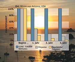 GORE TENARA Nähfaden bewahrt seine Festigkeit auch bei regelmäßiger UV-Einwirkung durch Sonnenlicht. Die UV-Beständigkeit ist in den Nähfaden integriert, sie ist kein Zusatz oder eine Beschichtung, die sich abnutzen kann.